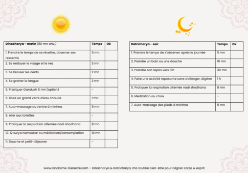 Ces recommandations sont générales et ne se substituent pas à un traitement médical et un accompagnement personnalisé selon votre prakriti/vikriti (constitution de naissance/déséquilibres). Dinacharya et Ratricharya peuvent être ajustés à vos besoins. N’hésitez pas à consulter.