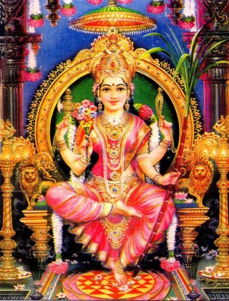 Elle est la Reine des reines, Rajarajeshvari, « la très rouge ». La transcendante Lalita Maheshvari Mahatripurasundari. Son mantra est KA E I LA HRIM HA SA KA HA LA HRIM SA KA LA HRIM ainsi qu’une 16ème syllabe secrète.